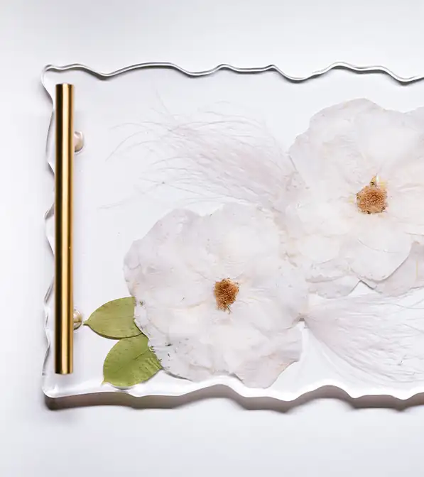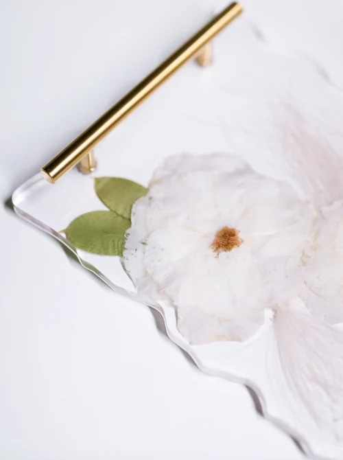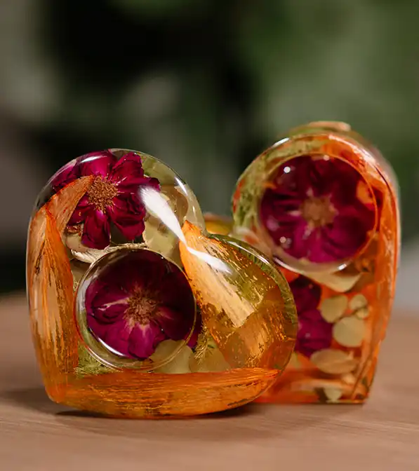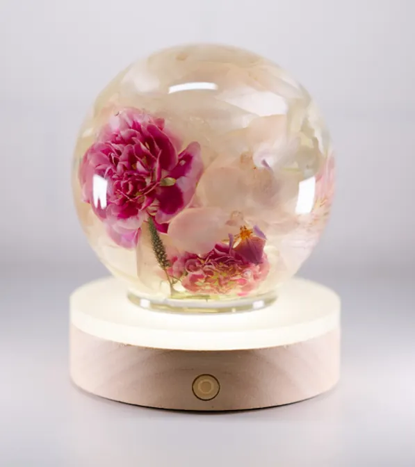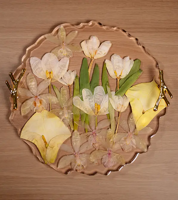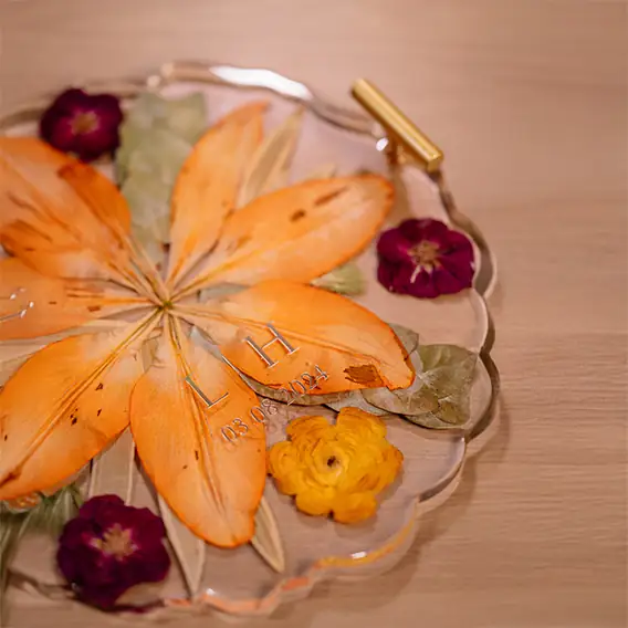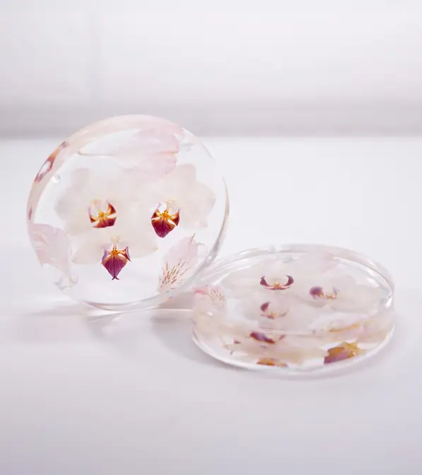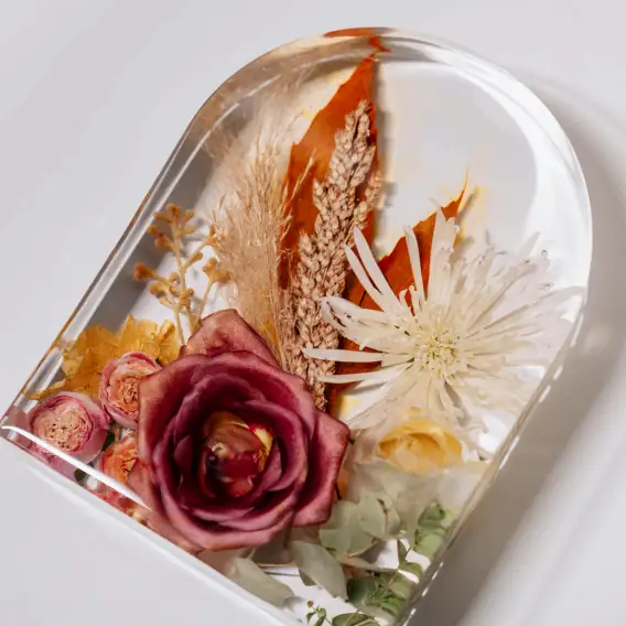 Após finalizar o encapsulamento total das flores vamos para o acabamento que é o lixamento e polimento da peça. Cada peça é única então necessitamos de atenção e cuidado para tornar essa peça impecável e com altíssimo brilho. (Chamamos de DOMING) Que é a aplicação de uma camada extra de resina especial para dar esse Glow up na peça.